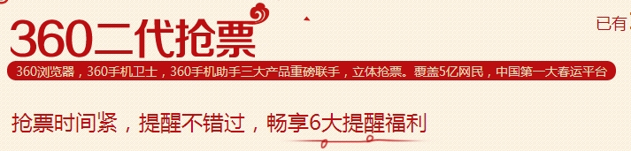 360二代抢票神器来袭!360浏览器,360手机卫士,360手机助手三大产品重磅联手,立体抢票。覆盖5亿网民,中国第一大春运平台。