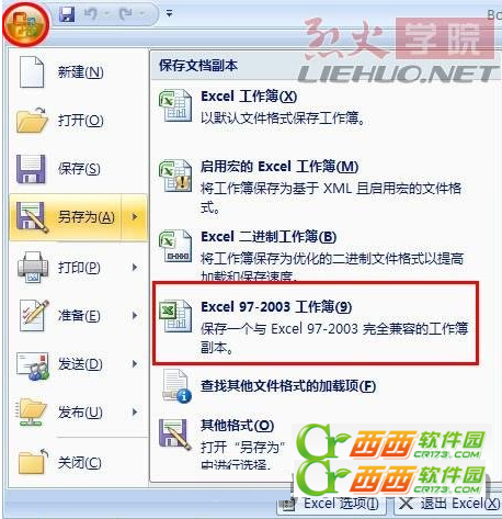 进入Excel2007以后单击“Office按钮”在弹出的下拉菜单中选择“另存为”,然后选“Excel97-2003工作簿”就可以将xlsx文件保存为xls格式的文件了。
