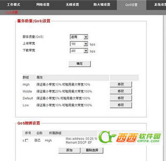可以在此添加/删除服务质量(QoS)的规则,以确保为每种流量提供不同的带宽和优先权。通俗地讲,就是限制每一个组群的带宽,让有限的带宽发挥最大的效用。让优酷用户不影响下载用户的下载用,让游戏用户不因下载用户而卡倒。