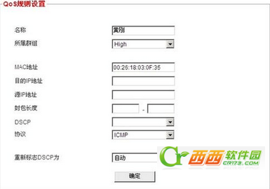 在相关栏目里填入对应的信息 名称:规则命名 所属群组:选择要加入的群组 MAC地址:填入电脑网卡的MAC地址 目的IP地址:填入要控制的目的IP 源IP地址:填入本地的IP地址 封包长度:设置通过路由器的数据包的大小 DSCP:差分服务代码点,通过编码值来区分优先级,这里没有特殊需要,可以不用设置,保存默认就可以。 协议:针对某些协议的控制 填好这个之后,点击“确定”,那么这个规则的设置就好了。这些规则,可以全部都设置,也可以选择一小部分进行设置。这里可根据个人需求进行设置。