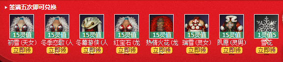 2、活动期间,签到满5次,即可用灵值兑换圣诞装和雪花。圣诞装限兑换一次,雪花限兑换5次。
