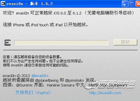 3、打开你下载好的evasi0n,并确保你的已经用USB连将你的iPhone5设备连接至你的电脑。