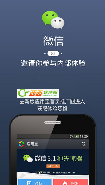 微信Androidv5.1限量内测版,抓紧时间体验,来晚了就等明年了!微信5.1新版已开启内部体验,请从新版应用宝首页顶部的推广图进入,抢先体验百人大群,飞机大战还有机会复活!