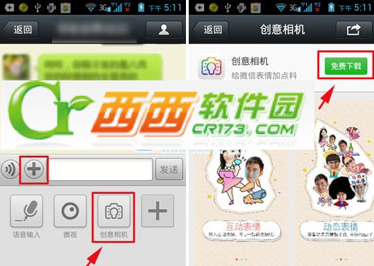 1)打开微信软件,进入聊天窗口点击“+”,然后点击“创意相机”,然后再点击下载。(如下图所示)