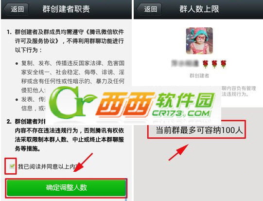 2)然后会有一份群创建者职责,同意后点击“确认调整人数上限”,那么现在你的群聊人数就变成了百人大群,还等什么,赶快邀请你的小伙伴们加入吧!(如下图所示)