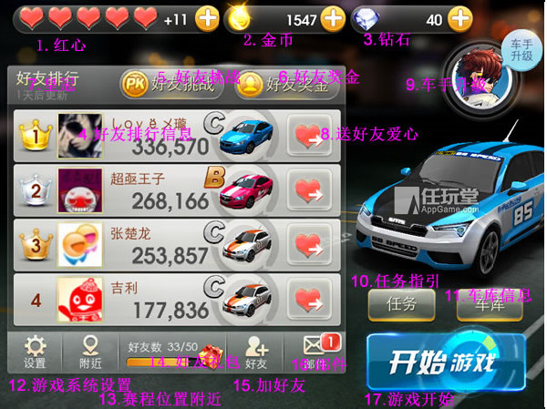 4.好友排行信息:可以看到自己的好友拥有的车辆,积分,排名等。