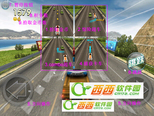 3.Combo超车:一段时间内连续惊险超车,可以促发Combo效果,获得高积分和更快速度。