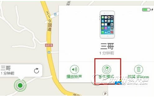 3、找到iPhone手机位置,点击绿色圆点,选择丢失模式