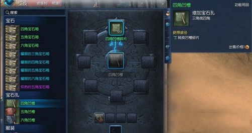 选择宝石孔-四角凹槽,使用3个四角凹槽碎片加1个灵石,变换费用10Y一次,有一定几率可以变换出四角凹槽。四角凹槽可以增加一个三角宝石孔或四角宝石孔!