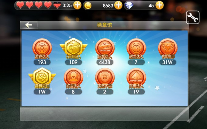 首先给大家看一下在这个模式下我用最烂的车满级能跑到的COMBO是109个!这个在勋章馆里面可以看到。