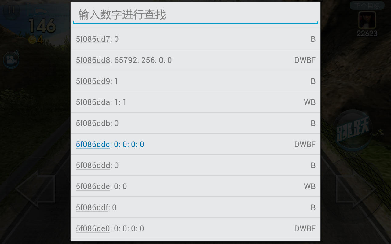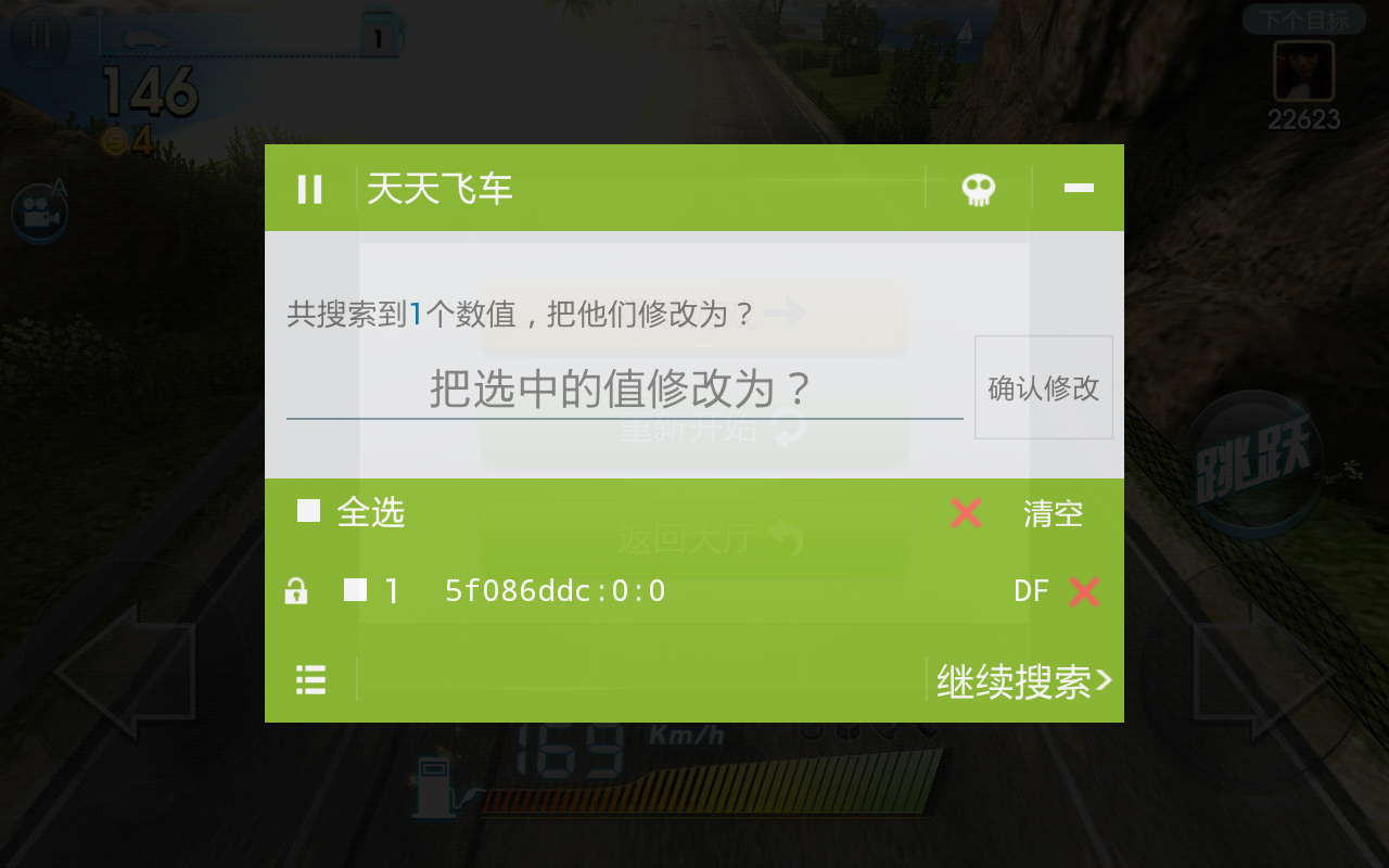 1、开始游戏后使用烧饼通过无限油,找到地址末尾为dc的唯一数据。(这个网上教程一大堆,有的叫做无限油,有的叫做无敌。具体操作就是大喷模式下搜索1,恢复正常搜索0,然后通过人工识别尾数为dc的唯一数据。)