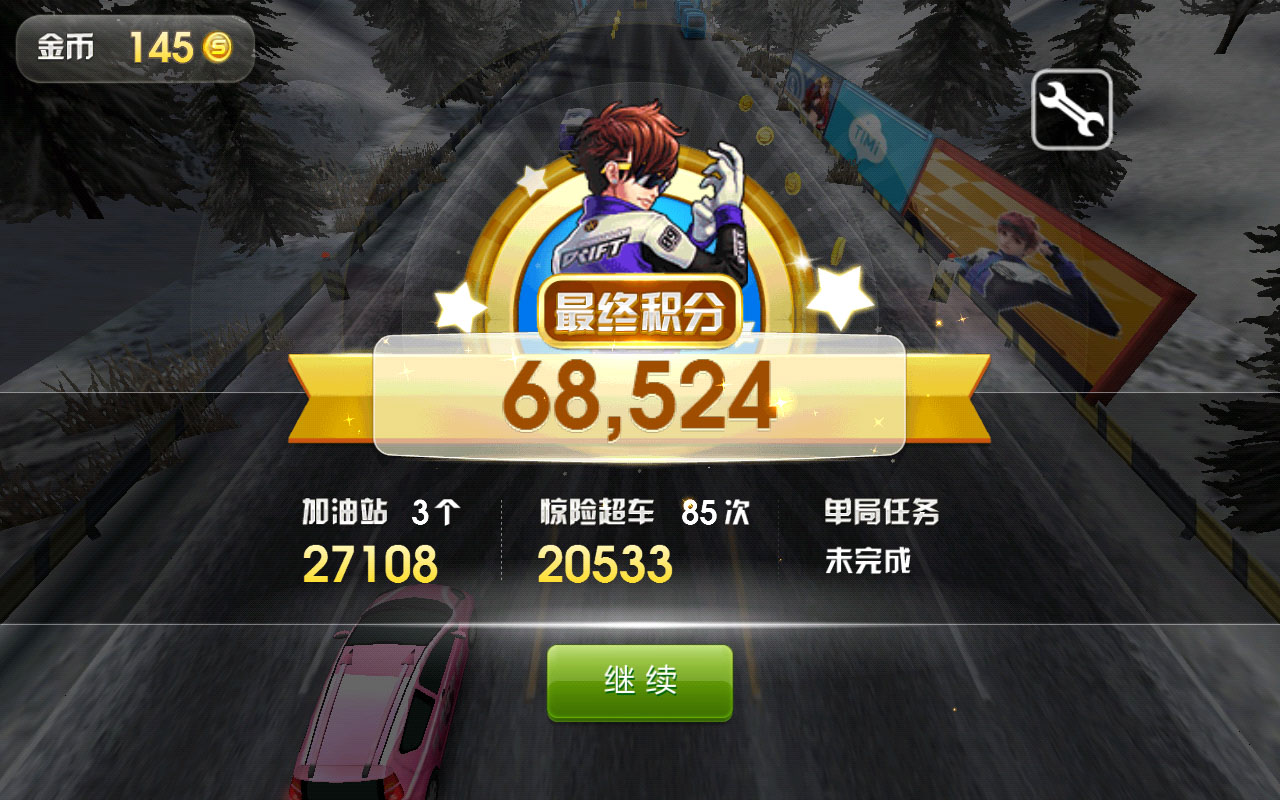3、等到燃油自然耗尽,结束游戏正常结算。(目前通过这种方式COMBO,最高分尚未超过13万,结算没有一次异常过!等待更多大家的测试结果,这个模式下车一直维持在最高速度,车的极限速度不够快根本跑不过第4个加油站,也无法劫持卡车。)
