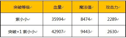 以60级紫小小为例,没有突破与突破+1的属性提升一览