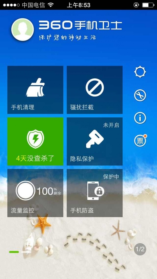 2、新版本的手机卫士还加入了抢票功能,在主界面的右侧有一个“票”字样的小圆圈,而不是左侧主要功能的方块形状。这个更新体现了在一年一度的春运大潮中,抢票插件已经成为几家巨头之争的标准武器,开始从PC端延伸到移动端。