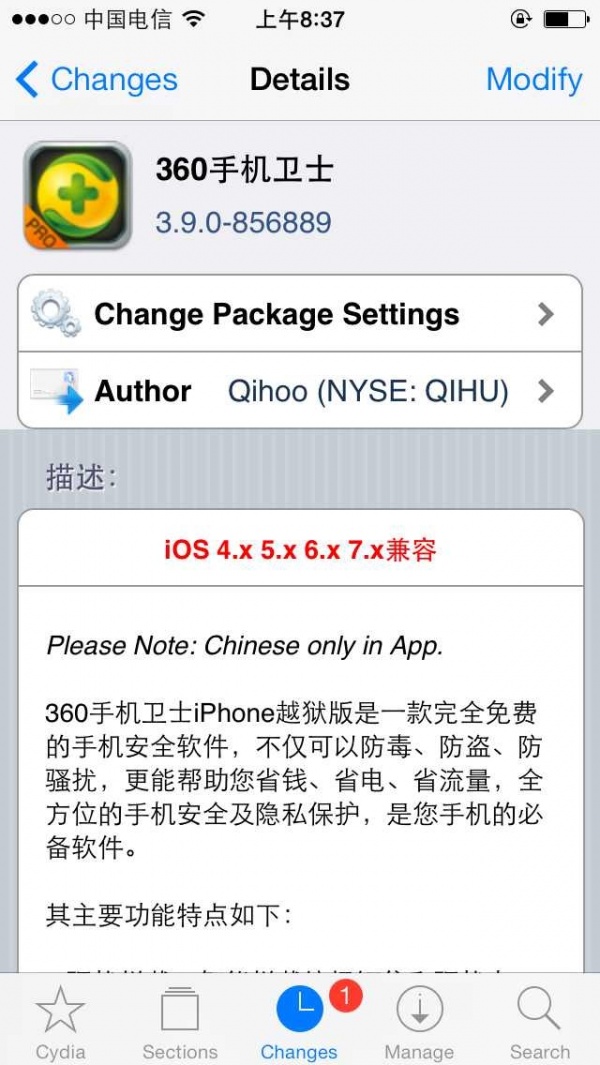 3、目前,在360手机卫士的官网上暂时下载不到最新的版本,越狱手机用户需要通过在Cydia里加入360官方源方可下载。