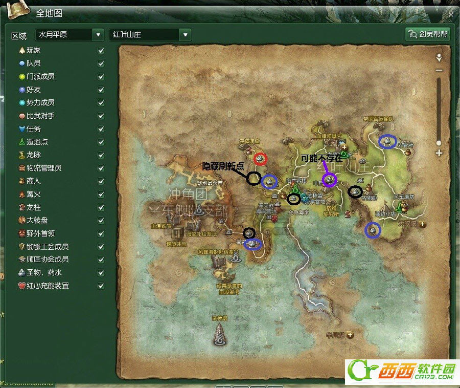黑色圈表示产量1-2个,刷新时间40分;蓝色表示2-3个,刷新时间70分;红色表示5-7个(俗称富矿),刷新时间180分。