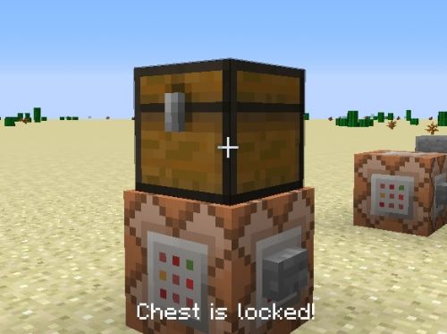 大家看见这条指令是在指令方块上面刷一个箱子。但是只有一个NBT:Lock。大家看见Lock后面打的是123456。当然,大家可以随便打。这个123456的意思就是只有名字叫123456的物品才可以打开。不是玩家,而是物品。123456只是物品的名字。如果改成654321,那就只有物品名字叫654321的才可以开启。当玩家没有指定的物品,而试图开启容器的话,画面会显示箱子以上锁(Chest is locked):