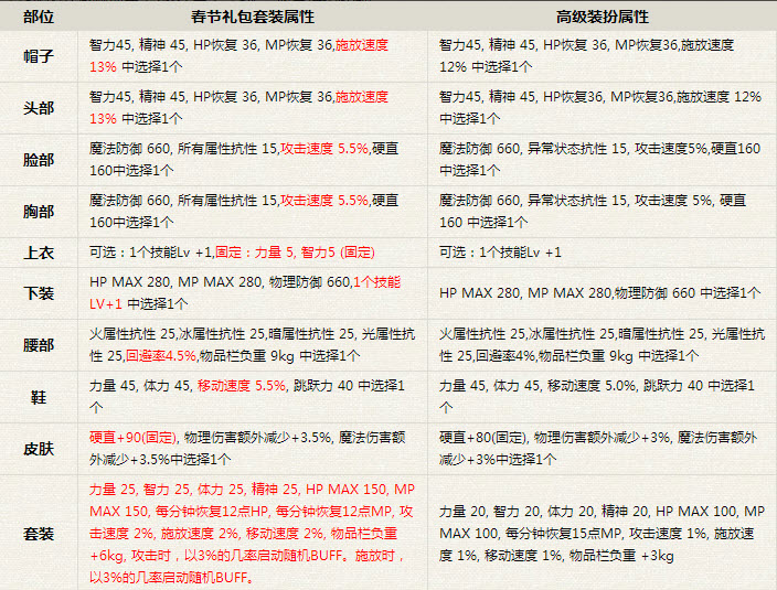 这次的春节礼包时装属性基本跟往年的节日礼包差不多,都是比高级时装多一点比天空套少一点没什么大的变化。