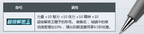 ![]() | 力量+10 智力+10 体力+10 精神+10 超级解密王赠予的称号。装备后,城镇中的移 动速度增加10%,强化和锻造费用享9.5折优惠。 |