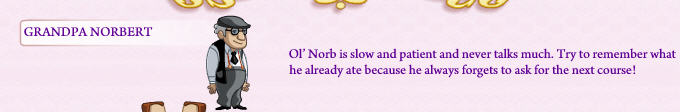 2.grandpa norbert--花痴老爷子。老爷子只看美女不知道点东西,按照上餐顺序给他上菜就行了。前提是他吃完上一餐了,话说是绝对的龟速……又慢还不冒泡,经常一批客人都去跳舞了,他还在餐桌上瞅着呢。可是我都忘记该给他上啥菜了,一样端一盘挨个试。虽然好脾气,不过也不能完全不管他,长时间不理他,他就直接要最后一道菜了事。(我有次把他彻底忘了,客人来往两大桌了,才想起来这个老头)