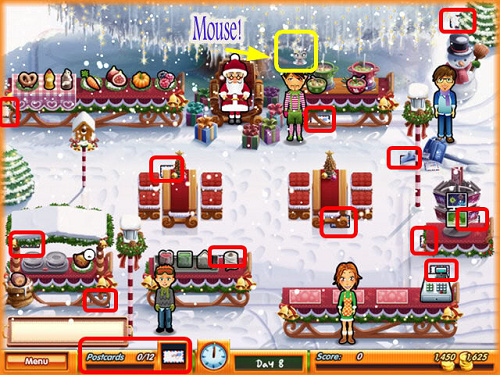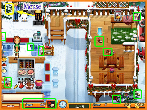 注意:A.要注意会有小孩和圣诞老人合照,点击坐在圣诞老人旁边的小孩可以获得50金钱奖励 B.如有坐在位子上的客人即将发怒,可点击装扮成小丑的F后再点击该桌客人就可表演节目以降低愤怒值。