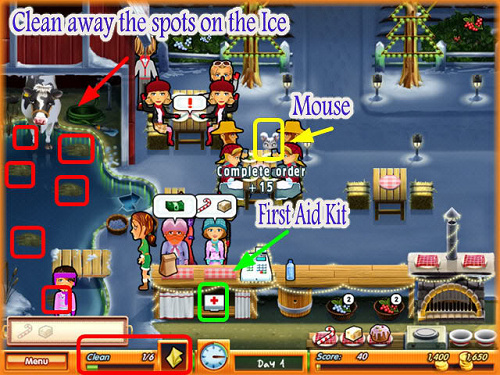 注意:1.小企鹅同前三关一样可以降低顾客愤怒值 2。那一锅黄油可以在不忙的时候先盛两碗放到桌子上,每碗获得50金钱