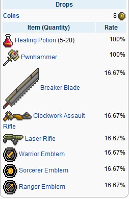 掉落8金币左右 道具:5~20治疗药水(+100HP) 圣锤(肉山后用它打碎恶魔祭坛) 破坏者大刀(破坏者巨剑)1/6概率 发条枪(三连发)1/6概率 激光枪1/6概率 勇士勋章1/6概率
