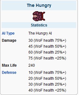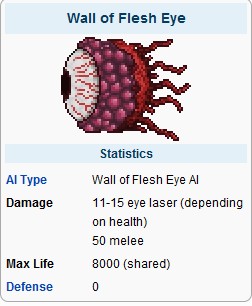 血肉之墙的眼球 攻击11~15(远程,激光)(血越少攻击越高)/50(近战) 生命值8000(和身体共有) 防御0