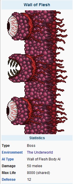 血肉之墙(肉山) boss 地点 地狱 攻击50(近战)(所以不要靠近它) 防御12