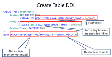 从宋大侠的博客中可以知道,内存数据库的创建过程其实就是将表存放到内存中,而不是整个数据库。下图展示 了创建内存优化表的语法,红色框标注了内存与传统表创建时语法不相同的地方。