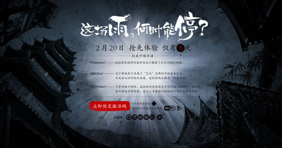 2月15日,网易神秘新游悬念站(http://yzr.163.com)悄然上线,从(安卓)字样可以看出这是一款手机游戏。悬疑页面整体风格古旧阴暗、诡异肃杀,用一段极具张力的flash表明,该游戏题材为充满变局杀戮的冷酷武侠。