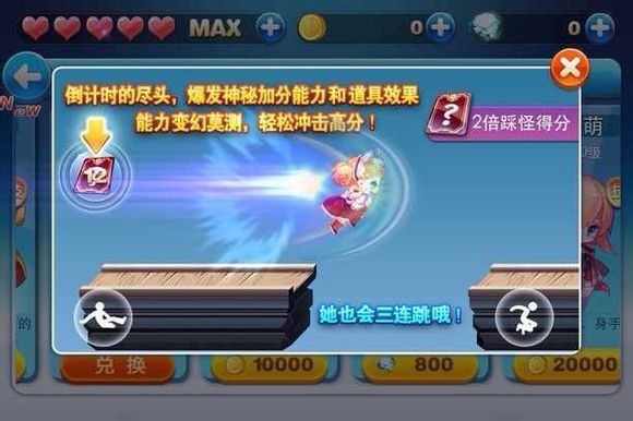 百变萝莉:神秘召唤技能(相当于加强版神圣祝福,其左侧的计时器时间到头就会触发神秘召唤,跟在百变萝莉身边的小宠物就会吐出一个随机道具,这个随机道是双倍踩怪、表现分+20%、高分五角星、冲刺等其中之一,随着百变萝莉等级的提高神秘召唤的冷却时间将会越来越短);还可以三连跳~