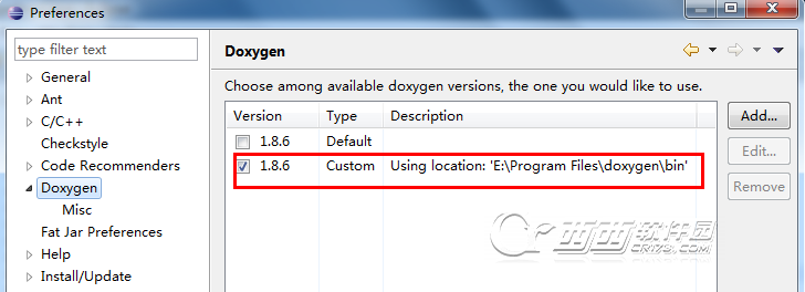工具栏上windows->preferences->Doxygen, 点击Add,添加doxygen安装目录中的bin目录,如下图所示:
