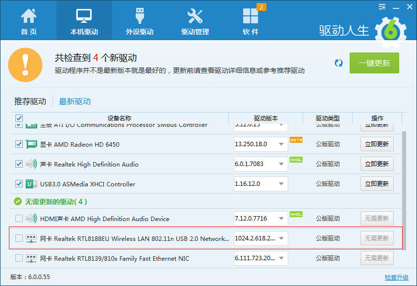 首先,确保无线网卡是否安装、驱动是否正常或者是否是最新完整驱动。这个可以通过驱动人生来查找。在驱动人生内检测电脑驱动,显示“Wireless”字样的网卡驱动就是无线网卡驱动,并且查看它的驱动版本,以及驱动人生是否提示它需要更新。下图中显示该无线网卡已经是最新版本。