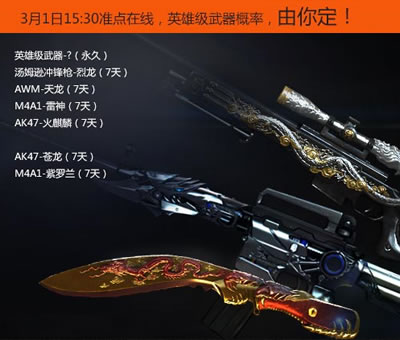 3月1日15:30准点在线,即可参与抽奖,有机会获得CF英雄级武器,天龙麒麟不再是梦想~