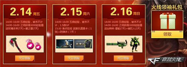 除了增益效果之外,2月14日14:00-16:00之间获得3000经验值的玩家,还能够额外再得到玫瑰手斧与爱之雷道具奖励;2月15日15:30准点在线,即可获赠复仇道具卡、防弹衣;CFer在2月16日14:00-16:00之间获得3000经验值,可再加送加特林-雷蛇与绿巨人奖励。