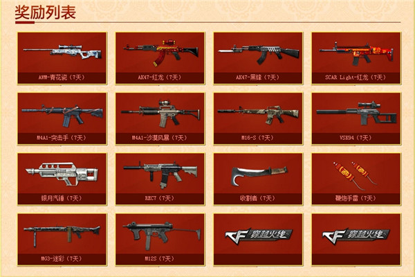 新年第一战活动期间,除了多倍经验、被杀不计的活动之外,还有首胜活动让玩家领取丰厚奖品。CFer每天在爆破模式获胜3局次日即可参与抽奖;每天(当日)邀请3位以上QQ好友一起游戏,且共同获得了一局胜利则玩家次日可再次获得一次抽奖机会。AWM-青花瓷、AK47-红龙、AK47-黑锋、SCARLight-红龙、M4A1-突击手、M4A1-沙漠风暴、鞭炮手雷等给力道具,助阵广大玩家在新年征战火线战场。