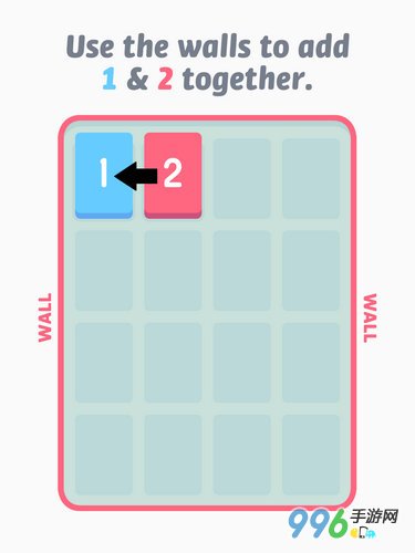 游戏是这样玩的,最基础的蓝色方块1和红色方块2通过上下左右划屏来将它们的位置摆成相邻的状态,然后往墙边(游戏中的“Wall”)的方向推,合并成白色的方块3。合体过程如图所示。
