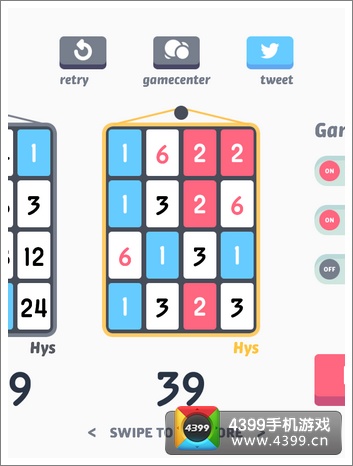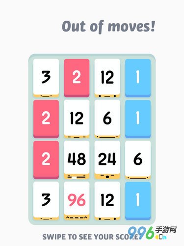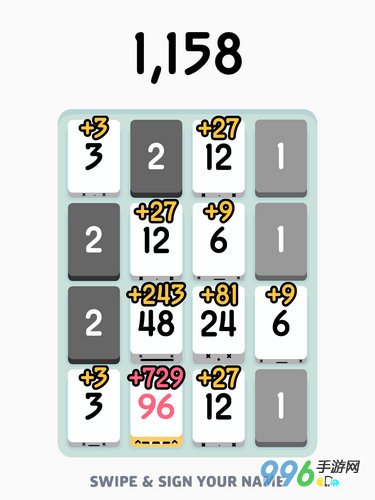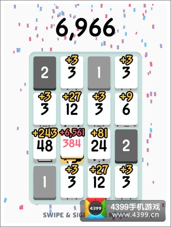 那么,如何是个尽头呢?直到4x4的格子被填满,游戏就会进入分值结算阶段,只有白色方块的分值才能被统计,计分的规则是:3的(K+1)次方。K是指得出该方块分值所需要的相加次数,比如分值48是经过3、6、12、24的四次相加所得,那么结算时这个方块的得分就是3的5次方即243分。弄懂这个计分方式不由得让蕉君沾沾自喜,谁让蕉君的数学曾经不及格呢 T.T