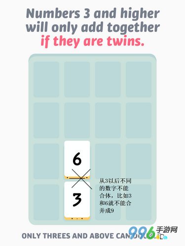 通过上述的方式合体以后,从3开始就只能是相同数字进行合体,比如3和3合体变成6,6和6合体变成12……如此类推,从3以后不同的数字不能合体,比如3和6就不能合并成9,唯一不同数字能合体的只有1和2。