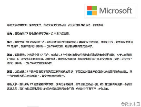 感谢大家对微软XP退休的关注。针对大家关系的问题,我们在这里做四点进一步的说明: