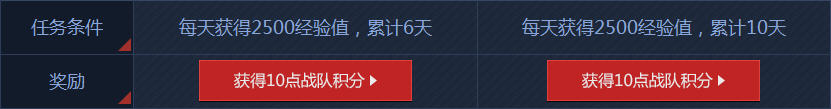 战队成员在活动期间累计6天,每天完成达到2500经验值的任务,该战队即可获得10点战队积分;累计10天可再获得10点战队积分