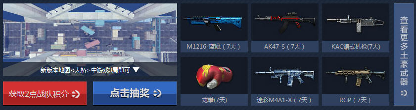 战队成员每天只要在新版本地图<大桥>中游戏3局,即可为该战队贡献2点战队积分,同时该队员可获得一次抽奖机会;