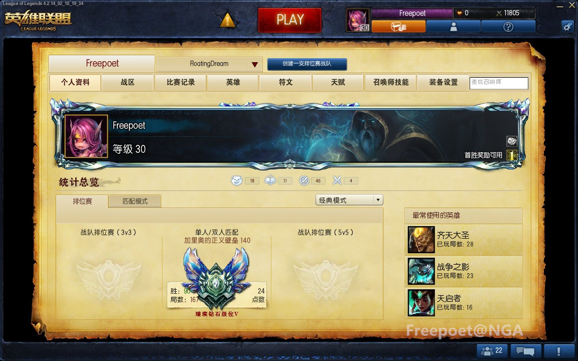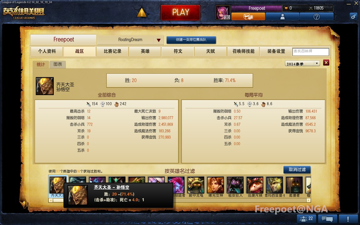 七分天注定,三分靠打拼。正如这句话,定级赛打了个3-7,定到了白金3让Fp欲哭无泪。之后打到了白金2,又掉到了白金4 0胜点也让Fp陷入了沉思,该用什么英雄上分。之中尝试了之前发过攻略的人马,虽然后期团战及开团能力不错,但是前期的gank并不稳定,并不很适合中低分段。前半段的分是靠人马上。打了一段时间AP寡妇,虽然高有5.0的KDA,但被翻盘的尴尬局面又常有发生。之后试了试新赛季初期打了1~2把的齐天大圣孙悟空(下文简称猴子),发现越发顺手,也借住这个英雄把胜率打正了。