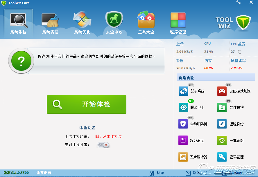 Toolwiz Care兔卫士是一款来自新加坡的免费卫士,功能方面和国内的卫士非常相近,但没有木马病毒查杀模块;除了系统体检、系统清理、系统优化等常用的优化功能,它还提供眼睛卫士、影子系统、抓屏等几十种实用工具。