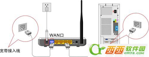 如下图所示WAN口连接宽带进线、LAN口连接局域网内的电脑。