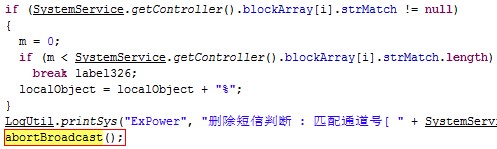 (图3 通过abortBroadcast屏蔽短信)