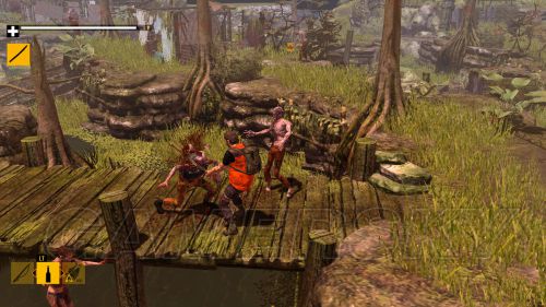 至于这些新玩意儿要拿来对付的僵尸─虽然我们在大屠杀的时候没看到很多种类的变异(标准类型之外只有一种「炸弹型」变异,死亡之后会爆炸),但数量很庞大,所以发明新方式杀死他们有一种病态的快感。在合作模式中,我们迷上用电锯屠杀包围我们的大批僵尸,但我们的同伴则利用弓箭保持距离除掉炸弹型僵尸。你也可以运用环境危机,像是在涉水而过时,在水中骚扰你的食人鱼。制作团队指出日夜循环系统是玩家要注意的地方─敌人在晚上会更加积极,所以必须事前做好防范。