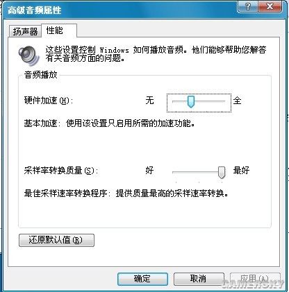 首先进入控制面板,打开“声音和音频设备”,点到“语声”选项卡,再点击“声音播放”下面的“高级”选项,然后切换到“性能”一栏,把“硬件加速”设置为“基本加速”(如图)——OK,搞定!