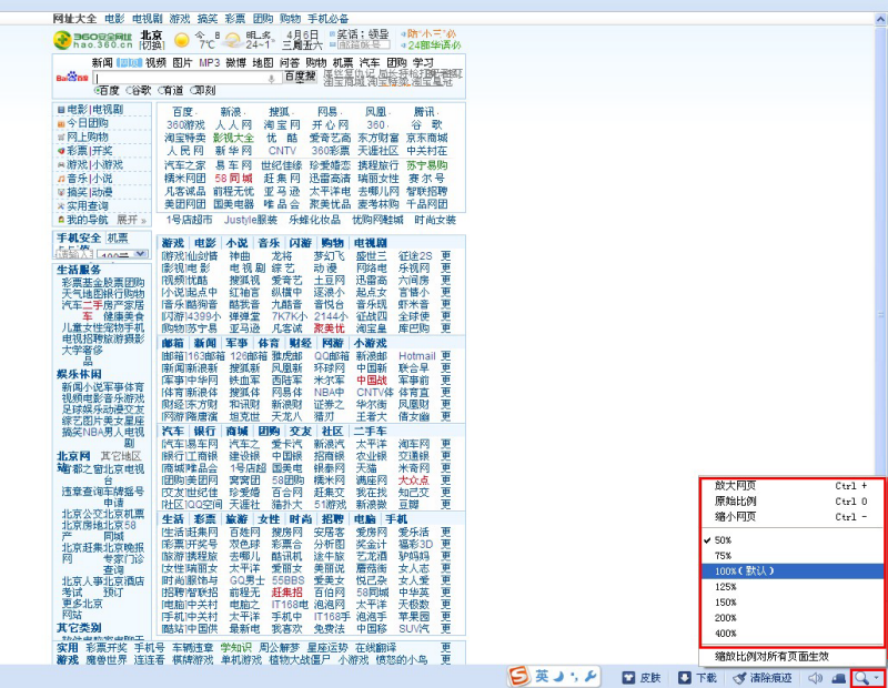 1. 以360极速浏览器为例。点击右下角的【放大镜】图标,调整到【100%默认】即可解决。其他浏览器类似。(如图1)